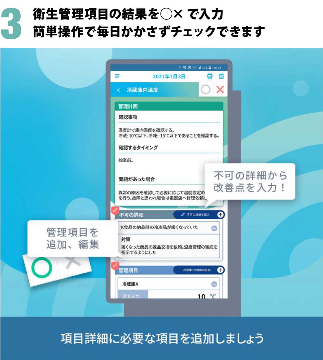 日々のハサップチェックに必要な機能が備わっています。