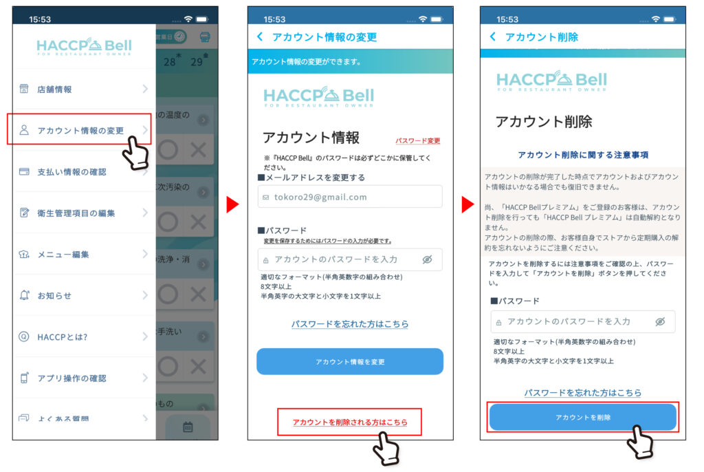 アプリ内メニューの「アカウント情報の変更」から「アカウントを削除される方はこちら」をクリックし、注意事項をご確認いただいたのち削除をおこなってください。