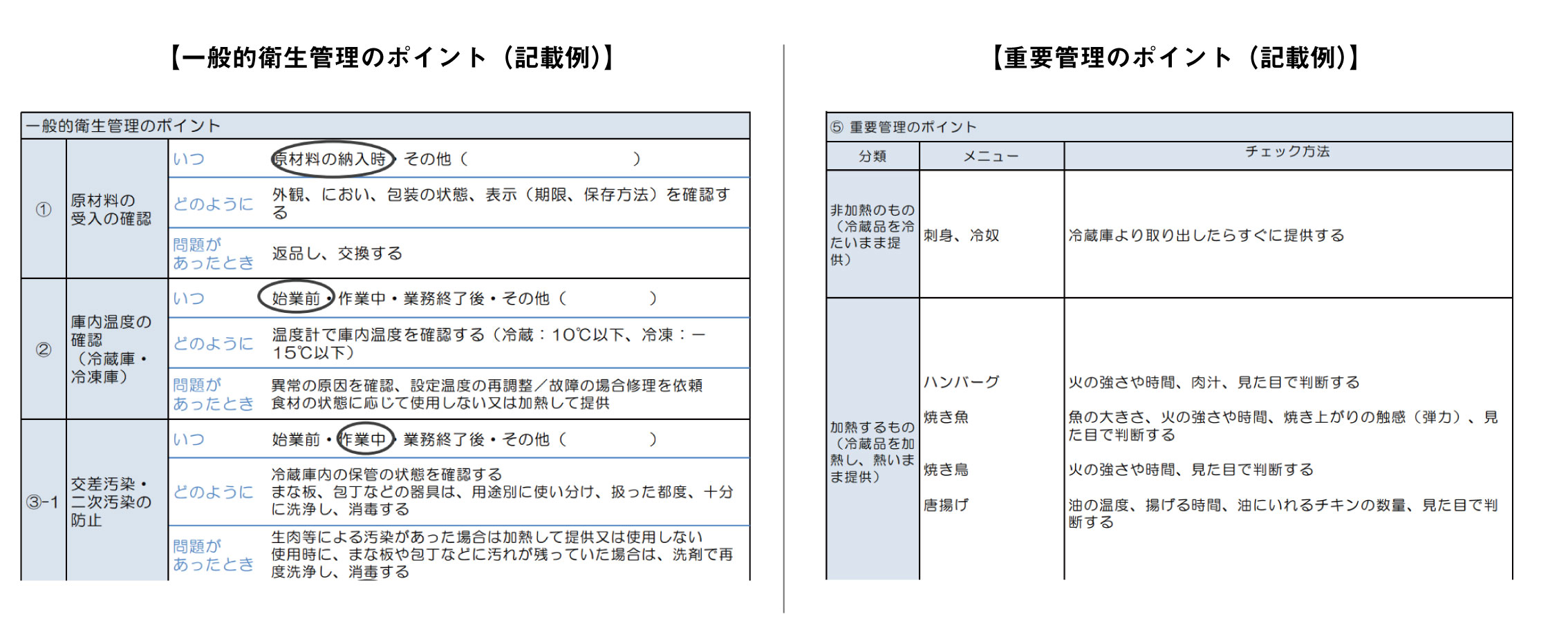 一般的衛生管理のポイント(どの食品についても行うべき共通事項)」と「重要管理のポイント(食品の調理方法にあわせて行うべき事項)」です。それぞれの基準に基づき衛生管理計画を作成し、従業員に周知徹底を図ります。