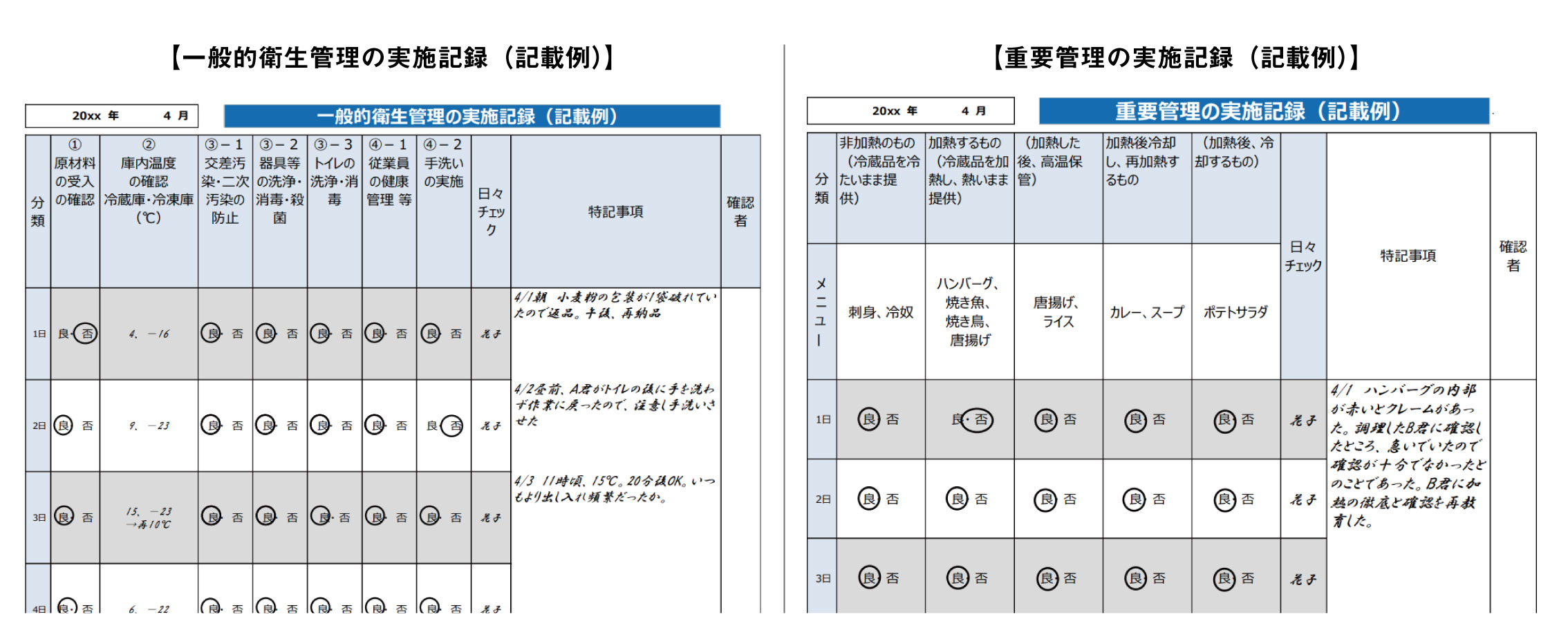 記録様式は、厚生労働省が発行している、飲食店向けの業種別手引書「HACCPの考え方を取り入れた衛生管理のための手引書(小規模な一般飲食店事業者向け)」に記載されています。